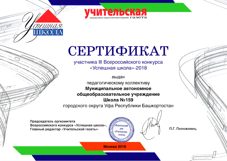 С целью выявления лучших образовательных организаций РФ на основе многокомпонентного анализа был проведён Всероссийской смотр-конкурс образовательных организаций: 900 лучших организаций среднего, основного и начального образования (школ, гимназий, лицеев); . В мероприятии приняли участие 34186 участников. Подведены итоги этого конкурса. Участники определены в следующие номинации: активные участники и лауреаты-победители. Очень приятно, что МАОУ "ЦЕНТР ОБРАЗОВАНИЯ 159" был признан ЛАУРЕАТОМ-ПОБЕДИТЕЛЕМ.